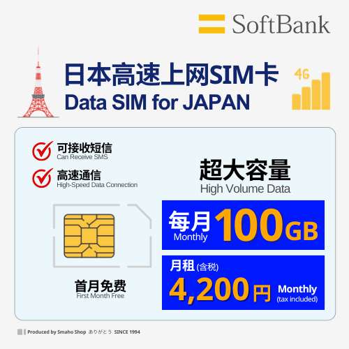Softbank每月高速流量100GB,低速不限量,附日本号码可接收短信。SIM卡插入机器后仅需简单APN设置即可使用。 购买当月月租免费,次月开始计算。商品价格包含 SIM卡发行手续费+购买月数x月租4,200円(含税)。
