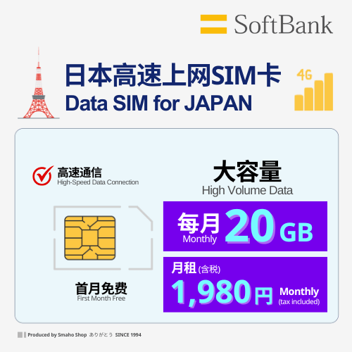 Softbank直回线,每月高速流量20GB,低速不限量。SIM卡插入机器后仅需简单APN设置即可使用。 购买当月月租免费,次月开始计算。商品价格包含 SIM卡发行手续费+购买月数x月租1,980円(含税)。