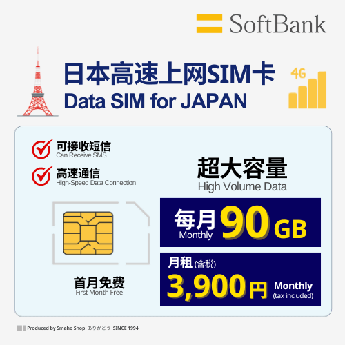 Softbank直回线,每月高速流量90GB,低速不限量,附日本号码可接收短信。SIM卡插入机器后仅需简单APN设置即可使用。 购买当月月租免费,次月开始计算。商品价格包含 SIM卡发行手续费+购买月数x月租3,900円(含税)。