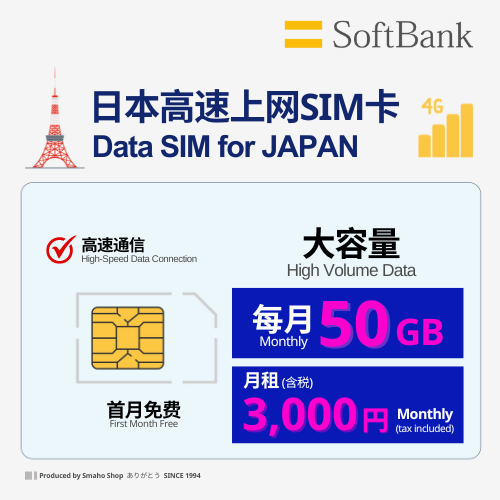 Softbank直回线,每月高速流量50GB,低速不限量。SIM卡插入机器后仅需简单APN设置即可使用。 购买当月月租免费,次月开始计算。商品价格包含 SIM卡发行手续费+购买月数x月租3,000円(含税)。